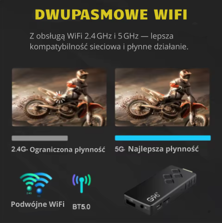 Stabilne połączenie bez kompromisów! Dzięki obsłudze WiFi 2.4 GHz i 5 GHz zyskujesz nie tylko pełną kompatybilność z każdą siecią, ale też błyskawiczny transfer danych, płynne streamowanie i brak irytujących przerw. Niezależnie od tego, gdzie jesteś – możesz liczyć na niezawodne połączenie.